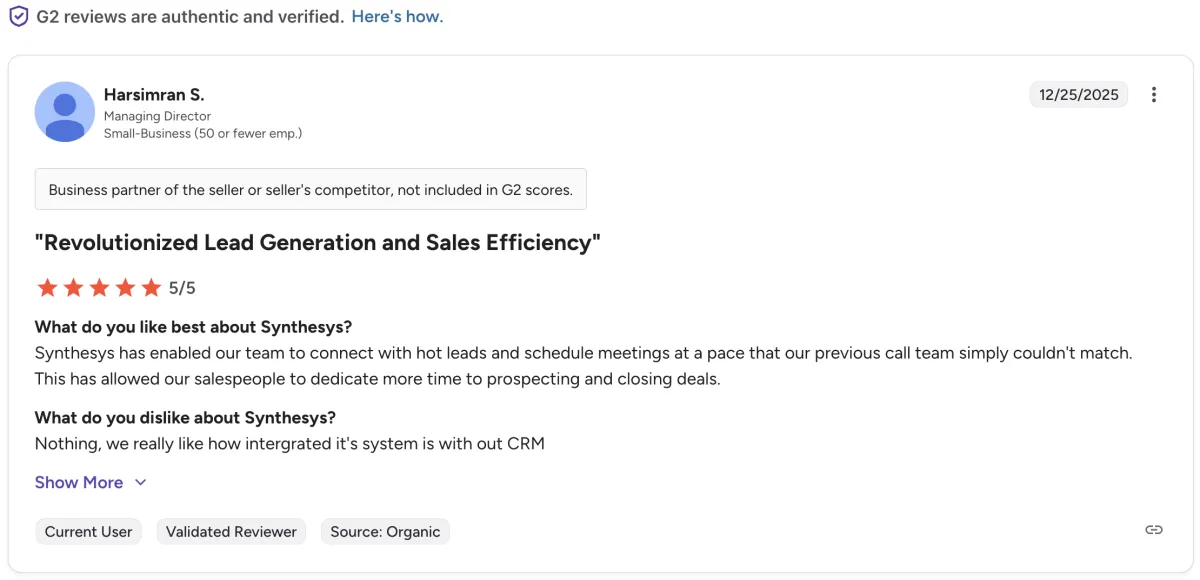 Synthesys has enabled our team to connect with hot leads and schedule meetings at a pace that our previous call team simply couldn't match. This has allowed our salespeople to dedicate more time to prospecting and closing deals.