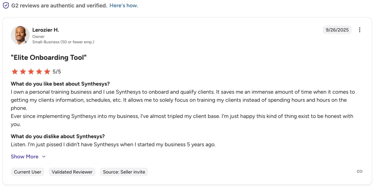 I own a personal training business and I use Synthesys to onboard and qualify clients. It saves me an immense amount of time when it comes to getting my clients information, schedules, etc.
